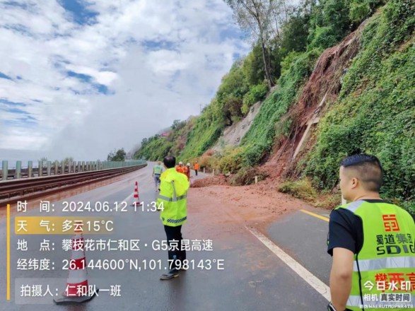2024年6月12日10时52分,攀西公司攀枝花管理处仁和路政管护队在雨后巡查过程中发现G5京昆高速公路攀田段K2501+200方山大桥上(攀枝花至云南方向)有约50立方边坡塌方,占用了应急车道和部分行车道,严重影响车辆通行安全。