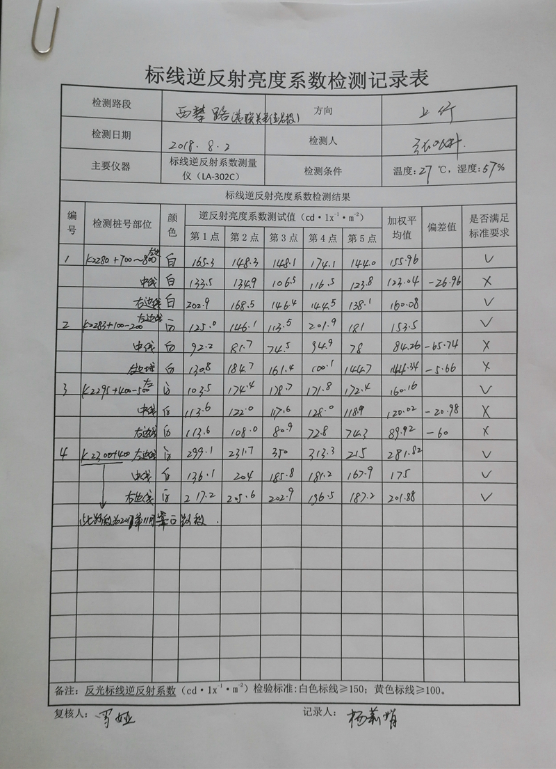 发布日期:2018-08-16 发布来源:养护部 阅读量:1,184次根据《四川省公路交通标线质量控制专项活动实施方案》要求,为深入贯彻“交通标线质量年”专项活动,公司立即购置了一台标线逆反射系数测量仪,2018年8月2日至16日,公司组织养护技术人员对西攀、攀田高速公路交通标线缺失、污损、逆反射系数等情况进行了专项调查,并建立问题台账。