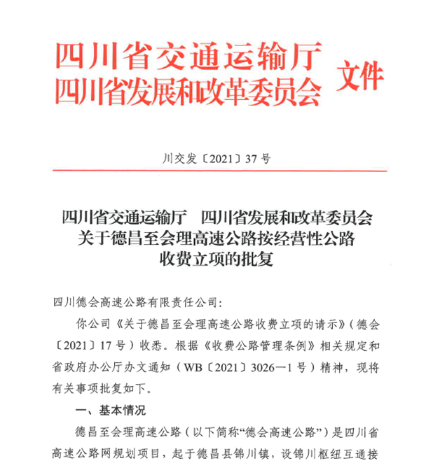 发布日期:2021-11-24 发布来源:本站点 阅读量:3,431次为顺利推进德会高速公路收费手续的办理,根据《收费公路管理条例》、《四川省高速公路车辆通行费定价办法》(川交发﹝2020﹞26号)要求,公司领导提前谋划、提前部署,收费管理部、工程技术处、财务管理部等相关部门积极配合、全力协作、主动作为,及时展开了大量的具体工作。经省人民政府同意,2021年11月19日,四川省交通运输厅、四川省发展和改革委员会印发《关于德昌至会理高速公路按经营性公路收费立项的批复》(川交发〔2021〕37号),对德会高速公路收费立项进行了批复。为下一步提前做好德会高速公路正式收费手续的办理打下了坚实的基础。